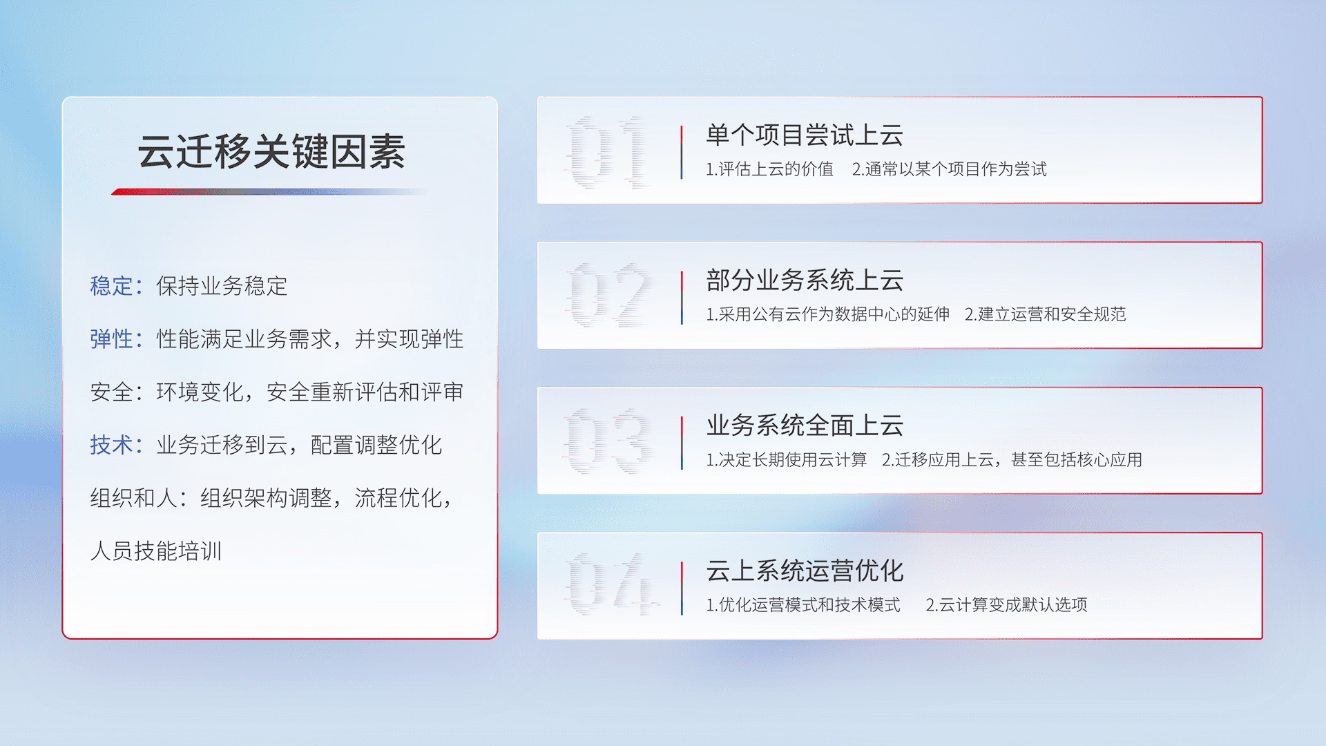 结合实际业务,,从规划设计、、、、云平台选型、、、、云原生改造、、数据迁移、、、集成交付,,迁移全过程为客户识别最佳上云路径,,,,做好风险识别管理,,,,设计网络架构、、、、身份权限、、、安全审计合规、、、操作审计、、日志审计、、、监控告警策略、、多站点容灾设计等,,,,对云上基础设施进行整体规划,,,,提升IT治理水平,,,,以满足弹性、、高可用、、、、高性能的需求。。